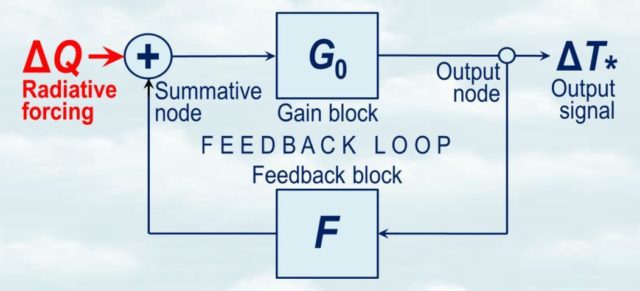 „Wir verwenden Verfahren und Terminologie von Rückkopplungsstudien in der Elektronik (Bode, 1945), um die Beiträge verschiedener Rückkopplungsprozesse analysieren zu können. Wir definieren die Systemverstärkung als das Verhältnis des Netto-Rückkopplungsanteils der Temperaturänderung zur gesamten Temperaturänderung“.