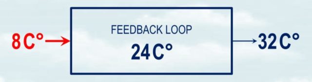 Abbildung 7: Klimawissenschaftler stellen sich vor, dass 8°C direkte Erwärmung durch vorindustrielle, nicht kondensierende Treibhausgase eine Rückkopplung von 24°C bewirkten. Ihr Systemverstärkungsfaktor beträgt also 32 / 8 oder 4: Mit anderen Worten, sie multiplizieren jede direkte vom Menschen verursachte Erwärmung mit etwa 4, um die endgültige Erwärmung zu erhalten. Da die direkte Erwärmung als Reaktion auf das verdoppelte CO2 in der Luft etwa 1°C beträgt, sagen heutige Modelle nach Berücksichtigung der Rückkopplung eine mögliche Erwärmung von etwa 4°C voraus.
