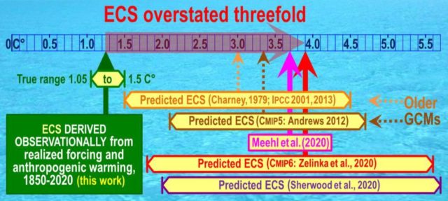 Widersprüchlicherweise hat der IPCC nicht auch seine langfristige globale Erwärmungsvorhersage reduziert, die trotz Milliardenausgaben für die Klimaforschung bei 1,5-4,5 °C pro CO2-Verdoppelung bleibt. Diese Vorhersage ist seit dem Charney-Bericht (1979) vor mehr als 40 Jahren unverändert geblieben. Sie war und ist übertrieben.