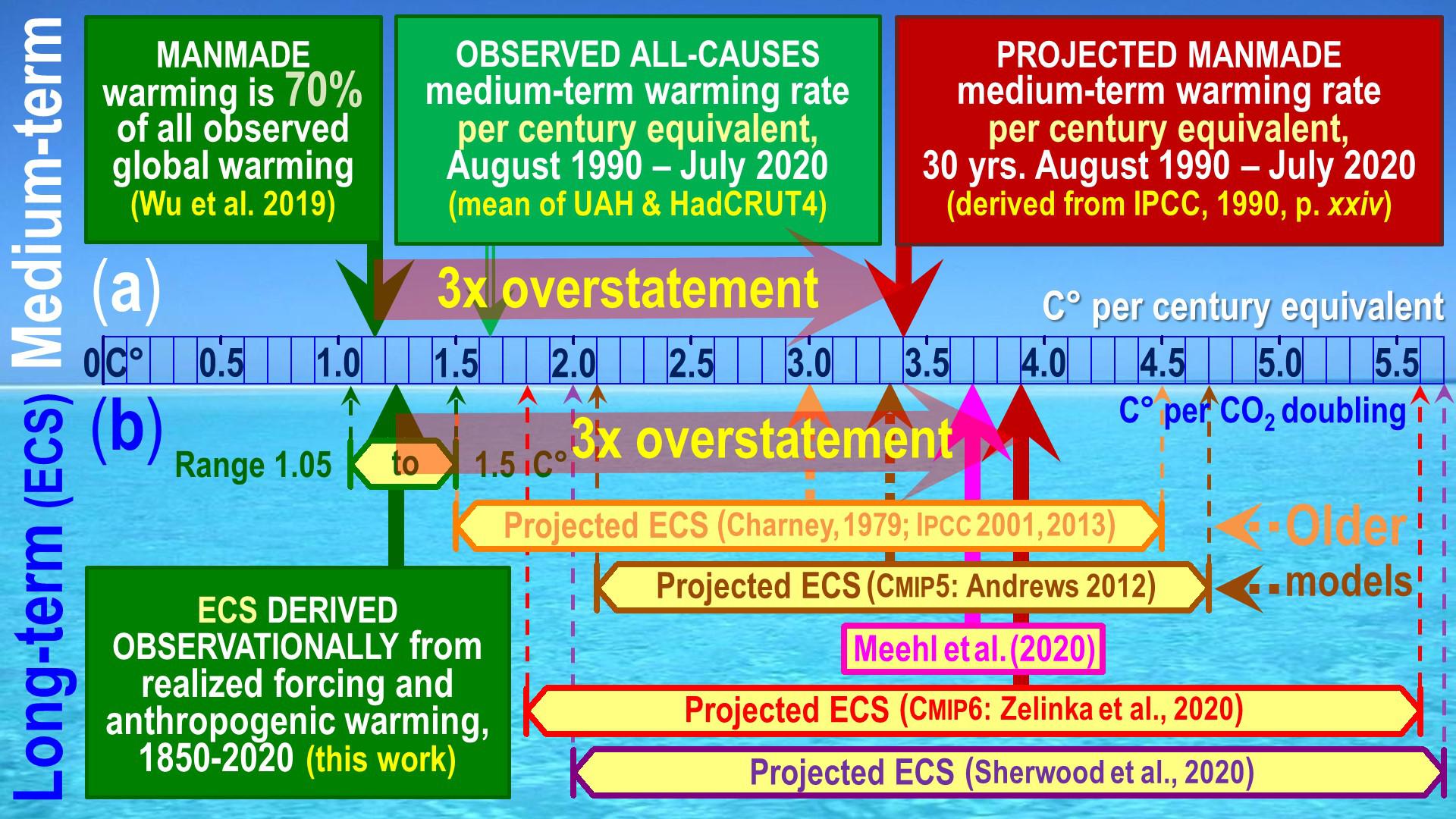 Abbildung 9: Klimatologen haben (a) die mittelfristige globale Erwärmung seit 1990 und (b) die langfristige, endgültige globale Erwärmung (d.h. die gleichgewichtige Klimasensitivität oder ECS) im Vergleich zu den auf Beobachtungen basierenden Werten überprognostiziert. Mittel- und langfristige Erwärmungsvorhersagen sind kohärent, wenn die Erwärmung um das Dreifache überbewertet wird.