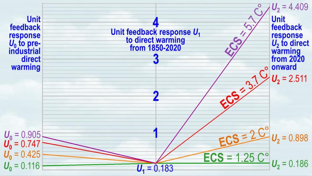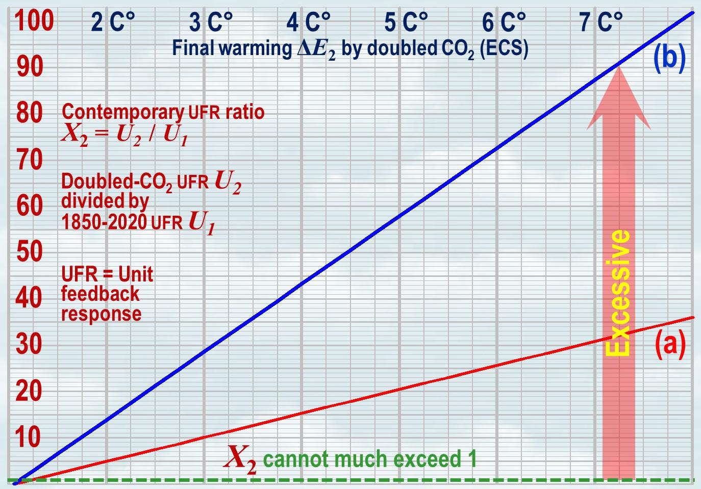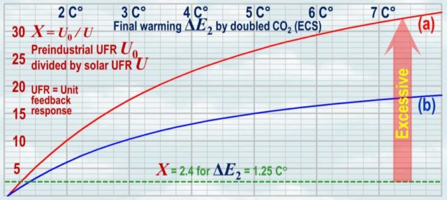 Selbst die von Klimawissenschaftlern prophezeite untere Grenze der Bandbreite von 2 °C impliziert einen vorindustriellen UFR, der zehnmal so hoch ist wie der UFR bei der Emissionstemperatur. Bei 1,25 °C ECS ist sie nur 2,4-mal so hoch.