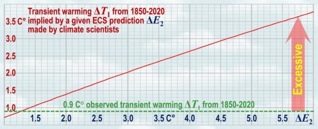 Abbildung 12: Alle derzeitigen Prognosen der Enderwärmung (ECS) von 2°C oder mehr aufgrund einer CO2-Verdoppelung im Zeitraum 1850 bis 2020 liegen weit über den gemessenen 0,9°C.