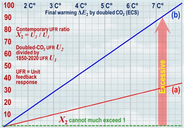 Abbildung 14: Der Anstieg des zeitweiligen UFR-Verhältnisses X2 (das von den UFR-Klimawissenschaftlern verdoppelte CO2-Verhältnis geteilt durch das UFR-Verhältnis 1850-2020), das sich aus der vorhergesagten Enderwärmung ΔE2 durch den gesamten Bereich der ECS ergibt, verdoppelte das CO2, wobei die Emissionstemperatur (a) 267,6 K und (b) 255,3 K beträgt, fallen die Vorhersagen fallen in Test 5 durch.