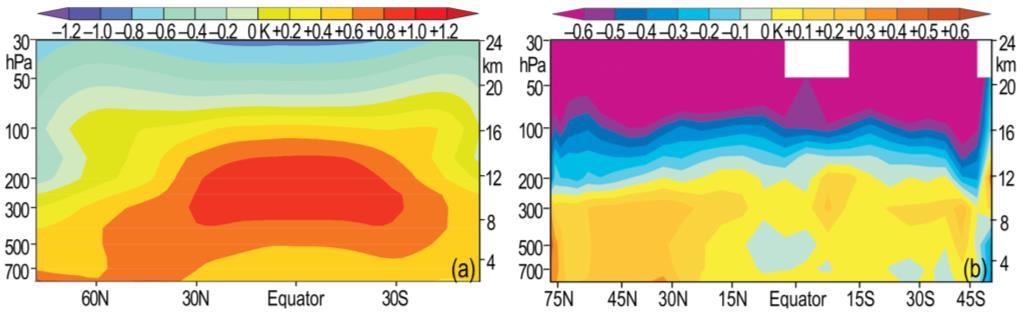 Abb. 15a (IPCC (2007, Abb. 9.1c) sagt diesen tropischen Hotspot in der Mitte der Troposphäre voraus, aber es gibt keinen Hotspot im realen vertikalen Temperaturprofil von bis zu 26.000 Metern Höhe, gemessen von Millionen von Ballonsensoren (Abb. 15b: Lanzante et al. 2006)