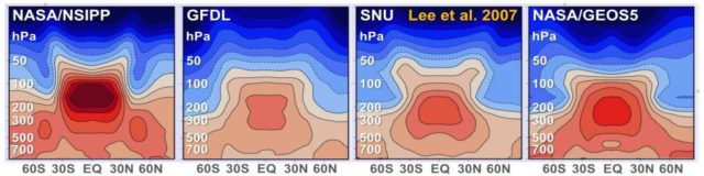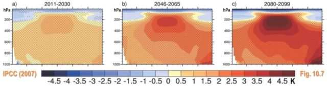 IPCC 2007 (Abb. 9.1: hier Abb. 17) nahm an, dass der Hotspot der Fingerabdruck der vom Menschen verursachten Erwärmung sei.