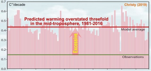 Obwohl das IPCC eine rasche Erwärmung der tropischen Oberluft vorhersagte, wurde sie in den Modellen von 1981-2016 im Vergleich zu den Daten aus der realen Welt um das Dreifache überbewertet (Christy 2019: hier Abb. 19).