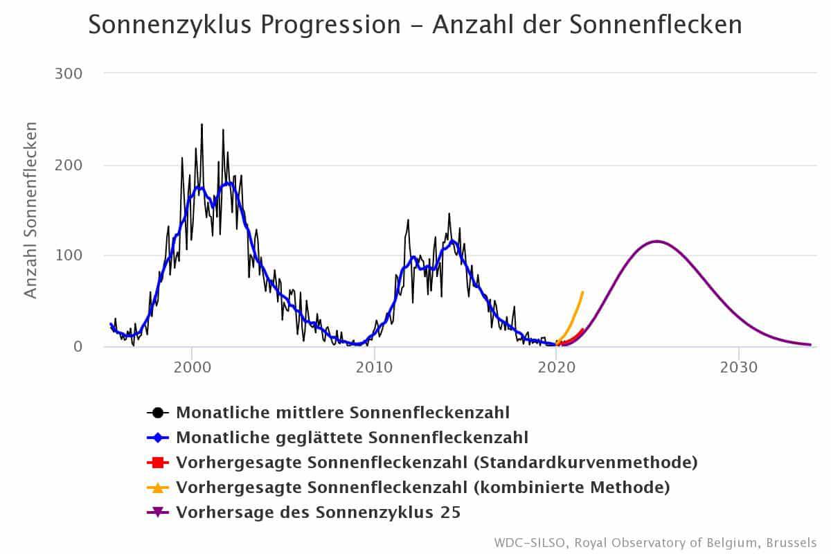 Abb.2 (Quelle) zeigt den 11-jährigen Schwabe-Zyklus (Zyklus 23 und 24) der Sonne bis 2020, sowie den projizierten 25 Sonnenzyklus bis 2030. Deutlich zu erkennen, dass die solare Aktivität, gemessen an der Sonnenfleckenzahl – diese betrachtet der Schwabe-Zyklus – deutlich zurück gegangen ist.