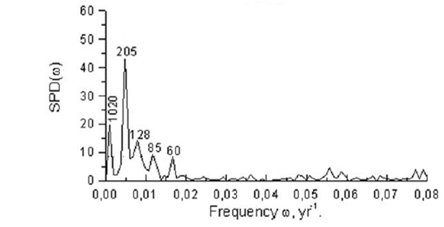 Abb.4, Quelle: Orgutschov et al. Aanhand der Fourier-Analyse werden in der Sonnenfleckenzahl verschieden Perioden sichtbar. Die dominanteste ist die 205-Jahres-Periode, was dem Hauptsonnenzyklus, dem im Mittel 208-jährigen de Vries/Suess-Zyklus entspricht. Darüber hinaus ist eine 85-Jahres-Periode, der Gleissberg-Zyklus, eine 60-Jahres-Periode (Landscheidt-Zyklus) und die 1.020-Jahres-Periode erkennbar.
