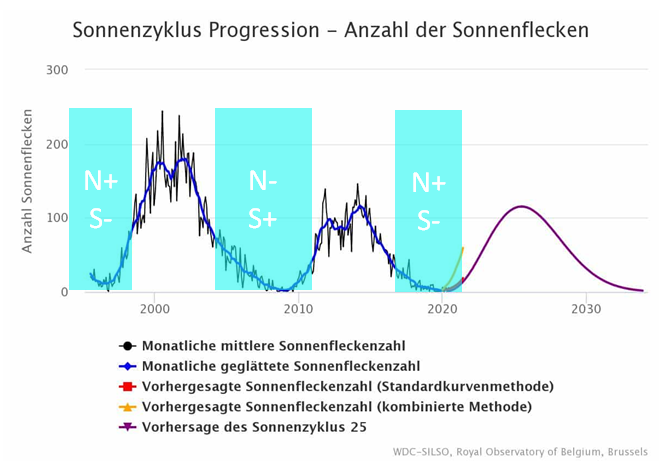 2. In Anbetracht, dass die Sonne noch 86% (normiert auf die Zeit) von ihrem Aktivitätsminimum in ihrem Hauptzyklus entfernt ist, sind Aussagen von einer schwachen oder gar „kalten“ Sonne unangebracht und fehl am Platz. Wir Menschen neigen lediglich dazu, Dinge, die wir sehen (hier deren Fleckenaktivität in Abb.2), höheres Gewicht zukommen zu lassen. Bei der Sonne, die neben ihrer Fusionsenergie die Erde mit ihrer magn. Energie direkt und vor allem indirekt beeinflusst, eine falsche Gewichtung.