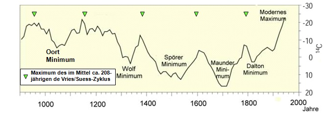 Abb.3 zeigt einen etwa 100 jährigen Anstieg der solaren Aktivität. Diese fällt zusammen mit dem Anstieg im Hauptsonnenzyklus, dem im Mittel 208-jährigen de Vries-Suess-Zyklus.