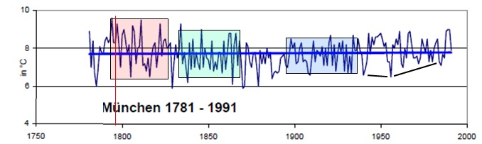 Diese Richtlinien sind sehr allgemein und können nicht jede mögliche Situation abdecken. Nehmen Sie deshalb bitte nicht an, dass das EIKE Management mit Ihnen übereinstimmt oder sonst Ihre Anmerkungen gutheißt. Wir behalten uns jederzeit das Recht vor, Anmerkungen zu filtern oder zu löschen oder zu bestreiten und dies ganz allein nach unserem Gutdünken. Wenn Sie finden, dass Ihre Anmerkung unpassend gefiltert wurde, schicken Sie uns bitte eine Mail über "Über Uns->Kontakt"Danke Raimund für den sehr informativen Artikel, dem ist doch noch was hinzu zu fügen. Abb.10: Die Jahrestemperaturen von München über 210 Jahre: 1) Als Trendlinie ergibt sich eine Gerade, übrigens genauso wie beim Hohenpeissenberg über den langen Zeitraum. Wo war die Erwärmungswirkung von CO2? Setzte die in Deutschland erst mit der Gründung des IPPC ein?2) Das Startjahr der DWD-Deutschlandbetrachtung ist 1881. Wie aus der Abb. 10 ersichtlich, liegt dieses Startjahr in einer Kältedelle, die von 1860 bis 1900 andauerte. Übrigens auch beim HPB. Aus einem Kälteloch heraus zeigt die Trendlinie immer eine Erwärmung. Wäre das DWD Startjahr 1900, dann hätte die Trendlinie nur eine moderate Steigung und die Erwärmung könnte nahezu restlos mit den steigenden Wärmeinseleffekten bei den Messstationen erkärt werden. Für eine CO2-verursachte Erwärmung bliebe nichts übrig.3) CO2-Abgaben und Steuern. Wer dennoch weiterhin an einen fürchterlichen CO2-Treibhauseffekt glaubt, der könnte ähnlich wie Gläubige jeden Sonntag seinen Obulus gegen die Sünden der Welt entrichten, und selbst mit gutem Beispiel vorangehen. Der Staat könnte spezielle CO2-Spendengelderhäuser einrichten, wo man sich öffentlich im CO2-Sonntagsanzug zum Treibhauseffekt bekennen könnte. Bessere Menschen sollten ihre Vorbildwirkung öffentlich zeigen.