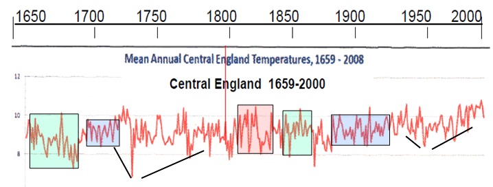 Abb. 11: Temperaturgangreihe Zentralenglands von 1659 – 2000 (Quelle: Prof. Ewert). Mit seinem ausgeglichenen Seeklima zwischen Atlantik und Nordsee nimmt England sicherlich eine Sonderstellung ein. Dies zeigt sich, dass hier die „grüne“ Phase von der „roten“ Phase nicht so stark differiert wie in Mitteleuropa. Aber auch hier ist das Muster, trotz der Moderation durch den Ozean, vorhanden. Auch beim davor liegenden Hauptsonnenzyklus, fallen zuerst die Temperaturen stark, bevor sie dann wieder ansteigen (schwarze Linien).