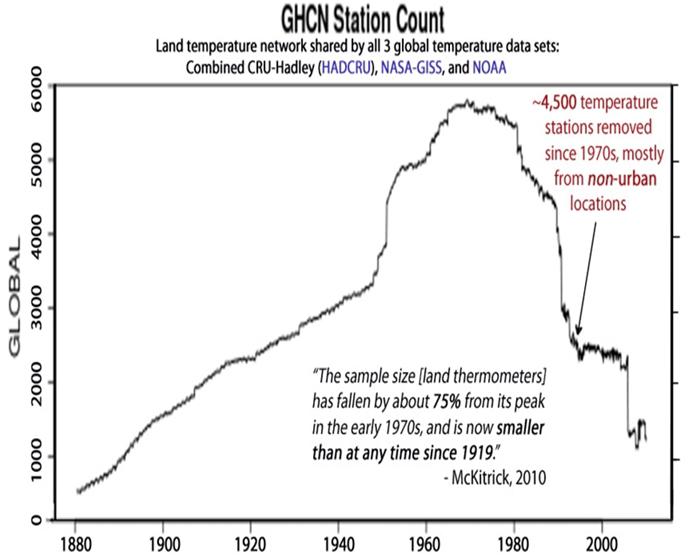 3. Meldungen von „höchsten“ Temperaturen, etc. sind auf dreiste Temperaturfälschungen, sowohl bei den Daten (bitte erinnern Sie sich an „Climategate“), wie bei der Messerfassung (vor 50 oder 100 Jahren wurde mit Quecksilber gemessen, heute durchweg elektronisch), aber vor allem bei der Auswahl der Messstationen zurück zuführen. Siehe Abb.12.
