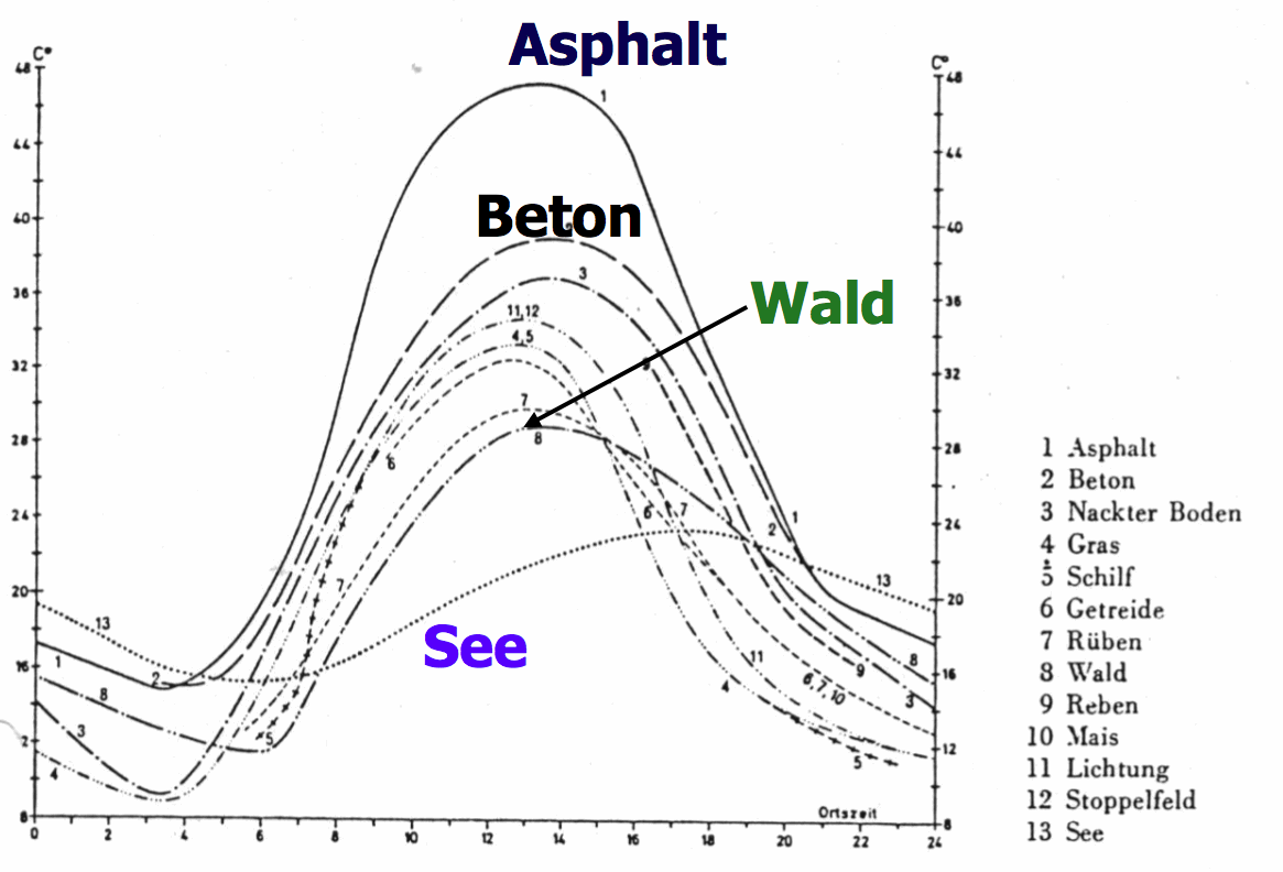 Zu Abb. 13: Nicht nur, dass über Beton und insbesondere Asphalt die Temperaturen z.B. sehr stark über denen des Waldbodens liegen, sondern auch, dass ein deutlicher Temperaturunterschied von mehreren °C zwischen Gras, Wald oder landwirtschaftlichen Flächen vorliegt. Messstationen, die ursprünglich auf freiem Feld standen und zwischenzeitlich in einer Gras, Hecken oder offenen Waldlandschaft stehen, weil sich das Landschaftsbild über die Jahrzehnte änderte oder städtische Messstationen, die fast 90% der Datenquelle ausmachen, geben somit deutlich höhere Temperaturwerte wieder und verzerren jeglichen Temperaturvergleich.