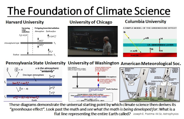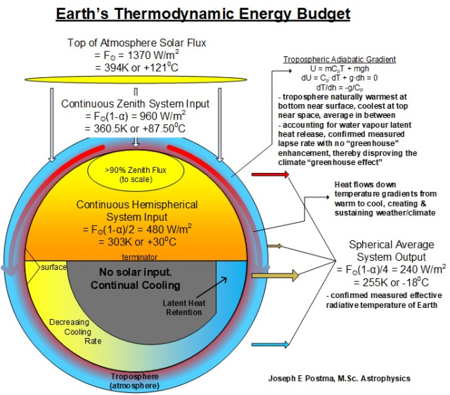 Das atmosphärische Gas in Anwesenheit eines Gravitationsfeldes und einer harten Oberfläche am Boden sortiert sich dann selbst so, dass der durchschnittliche thermische Energiezustand irgendwo in den mittleren Regionen zu finden ist: Es ist mathematisch unmöglich, dass der durchschnittliche thermische Zustand der Atmosphäre entweder ganz unten in der Atmosphäre oder ganz oben zu finden ist, *obwohl* der größte Teil der Erwärmung der Atmosphäre am Boden über die Konduktion mit der vom Sonnenlicht erwärmten Oberfläche stattfindet. Aufgrund der Schwerkraft, weil es sich um ein freies Gas handelt, und aufgrund der statistischen Mechanik (Mathematik) muss der durchschnittliche thermische Zustand der Atmosphäre um den Durchschnitt der Atmosphäre herum gefunden werden, d. h. um die mittleren Höhen (der Troposphäre).