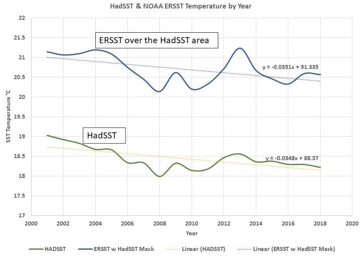 Nick erklärt, dass die Anomalien einen steigenden Temperaturtrend zeigen, weil sich seiner Meinung nach das Klima tatsächlich erwärmt. Er glaubt, dass die gemessenen Temperaturen eine Abkühlung zeigen, weil sich die Abdeckung der kalten Regionen mit der Zeit verbessert und dies einen künstlichen Abkühlungstrend erzeugt. Der Abkühlungstrend ist in Abbildung 1 zu sehen, die eine Darstellung der gemessenen HadSST- und ERSST-Temperaturen über derselben Ozeanregion zeigt. Nur 18% der Weltozeanzellen, im Jahr 2018, sind in Abbildung 1 dargestellt, hauptsächlich in den mittleren Breiten. Die in Abbildung 1 dargestellte Ozeanfläche ist viel größer als 18 %, da die fehlenden nördlichen und südlichsten Zellen kleinere Gebiete abdecken.