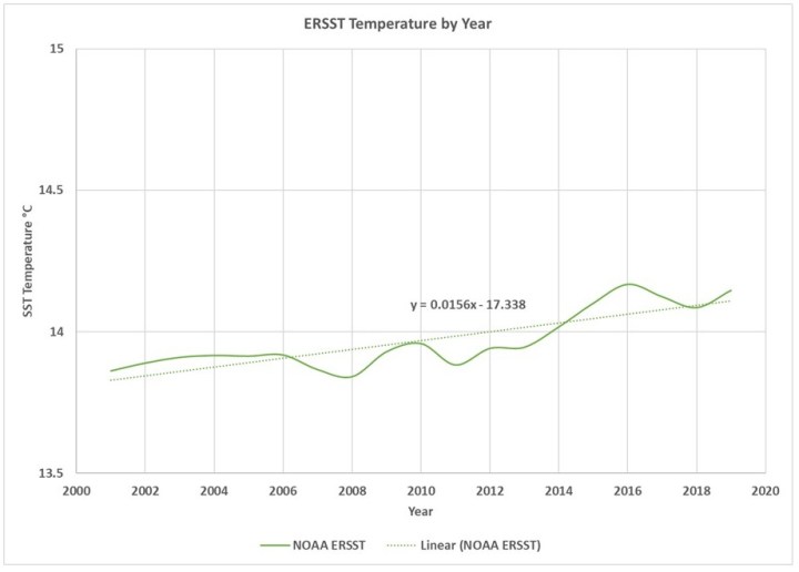 Abbildung 2. Wenn wir die ERSST-Gittertechnik der NOAA verwenden, sehen wir einen leicht steigenden Trend bei den Oberflächentemperaturen, etwa 1,6 Grad C pro Jahrhundert.