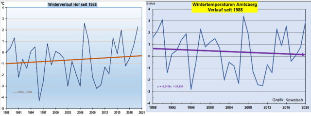 Abb. 6: Wärmeinselarme Stationen zeigen wie alle deutschen Wetterstationen zwar den Temperatursprung 1988, die Temperaturen hielten sich jedoch auf dem milderen Niveau, während die Stationen in wachsenden Wärmeinseln insbesondere im Sommer weiter wärmer wurden. In den letzten Jahren hat die Wetterstation Hof, die seit Jahren in ein Gewerbegebiet eingebaut wird das tiefer liegende und ländliche Amtsberg-Dittersdorf im benachbarten Sachsen überholt.