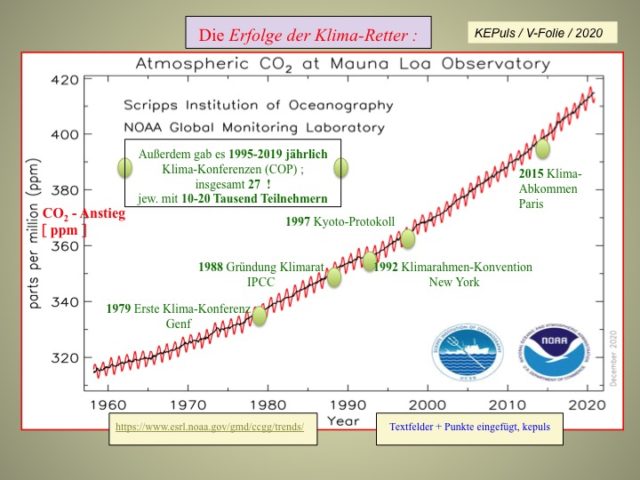 Diese Richtlinien sind sehr allgemein und können nicht jede mögliche Situation abdecken. Nehmen Sie deshalb bitte nicht an, dass das EIKE Management mit Ihnen übereinstimmt oder sonst Ihre Anmerkungen gutheißt. Wir behalten uns jederzeit das Recht vor, Anmerkungen zu filtern oder zu löschen oder zu bestreiten und dies ganz allein nach unserem Gutdünken. Wenn Sie finden, dass Ihre Anmerkung unpassend gefiltert wurde, schicken Sie uns bitte eine Mail über "Über Uns->Kontakt"„Mit und nach all den vielen Welt-Klima-Konferenzen ist es immer wieder gelungen, die Treibhausgas-Emission von CO2 in vielen kleinen Schritten zu erhöhen …“Genau so, danke für diesen gelungenen Beitrag, großen Dank an herausragende „Klimaschützer“ wie Gore, Schellnhuber („.. weil ich selber im Jahr bestimmt 100-mal fliege.“ https://bit.ly/38RgBj8), Schwarzenegger (https://bit.ly/2WZW6Ll), DiCaprio, Obama (https://pge.sx/3oaWvH4) u.v.a.m., die durch ihr Vorbild in der exzessiven Nutzung modern angetriebener Verkehrsmittel wie PS starken Autos, Düsenjets und Schiffen eine steigende Anhängerzahl junger Fans begeistern und besonderen Dank an die „Klimapolitiker“ Deutschlands, die durch ihre Deindustrialisierungsmaßnahmen dafür sorgen, dass immer mehr Firmen nach Osten, in Richtung Asien abwandern und dort mitsamt ihrer Emissionen expandieren und auch damit es den künftigen Generationen immer schwerer machen, die leuchtende Klimazukunft eines völlig überschuldeten, energietechnisch ruinierten (Wallstreet-Kapitalisten verleumdeten diese visionäre Zerstörung dtscher Stromversorgung als „World’s dumbest energy policy“ https://on.wsj.com/3n67HDp), aber klimapolitisch glücklichen Landes zu verhindern …