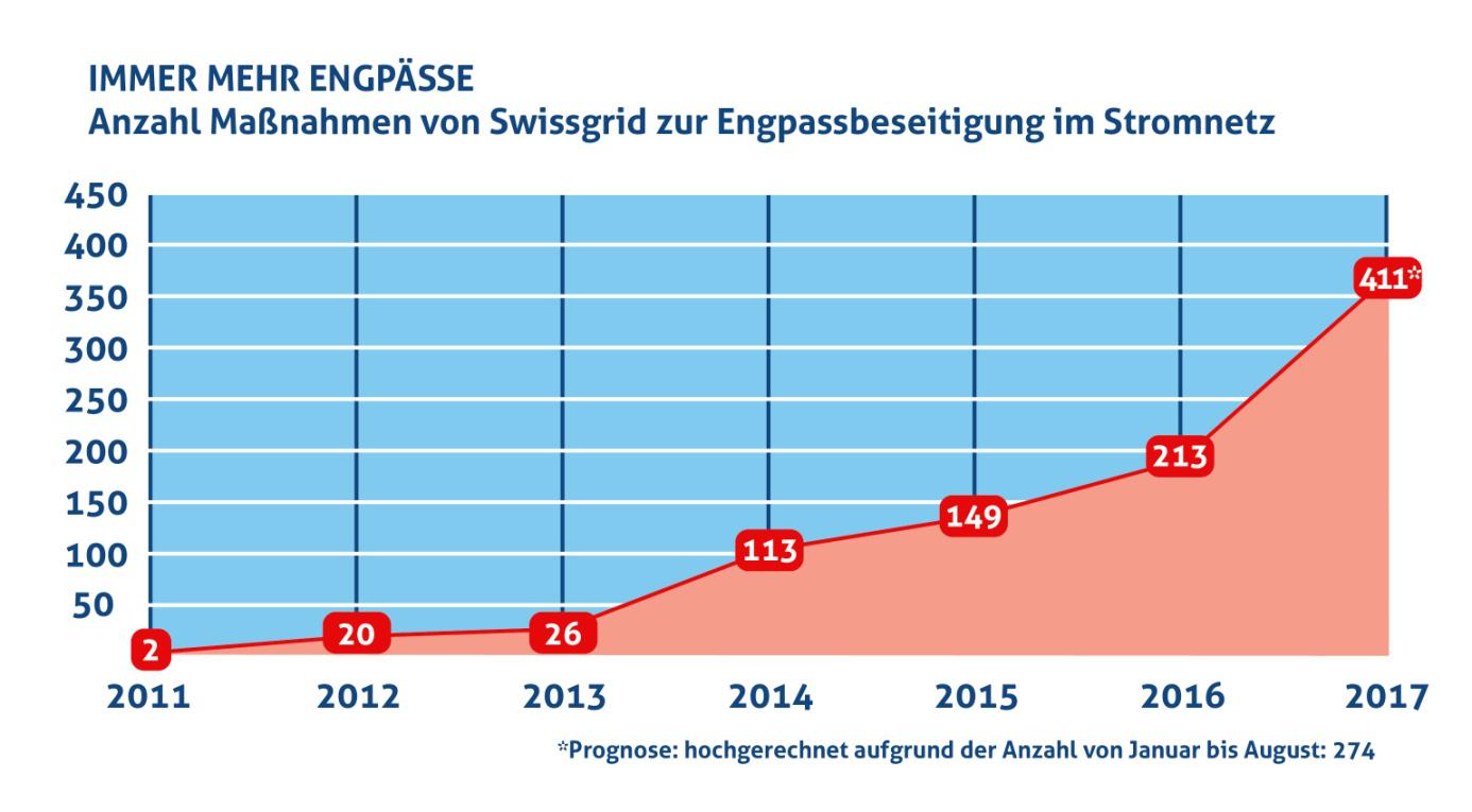 Bild 7: Entwicklung der Zahl von Redispatch-Maßnahmen im Schweizer Stromnetz, das ein Teil des Europäischen Verbundnetzes ist (Quelle: Swissgrid)