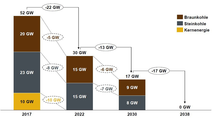 Nach der Abschaltung von 52 Gigawatt nicht fluktuierender Energie stünden dann im Jahr 2038 als gesicherte Energielieferanten noch Wasserkraft, Biomasse und Erdgas zur Verfügung, die heute etwa 23 Prozent des Bedarfs abdecken können. Um die fehlende Leistung nur theoretisch auszugleichen, müsste die Energieerzeugung aus Wind und Sonne mehr als verdreifacht werden.