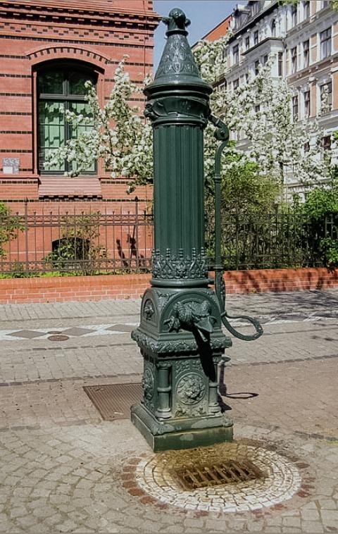 Bild 11: Brunnen mit Schwengelpume, wie er u. a. in Magdeburg und Berlin als Notbrunnen deklariert ist. Mit einer Förderleistung von ca. 1.200 Liter pro Stunde könnte er innerhalb von 12 Stunden den Minimalbedarf von 900 Menschen decken. Sein Versorgungsgebiet dürfte wohl die zehnfache Einwohnerzahl enthalten. Quelle: /31/