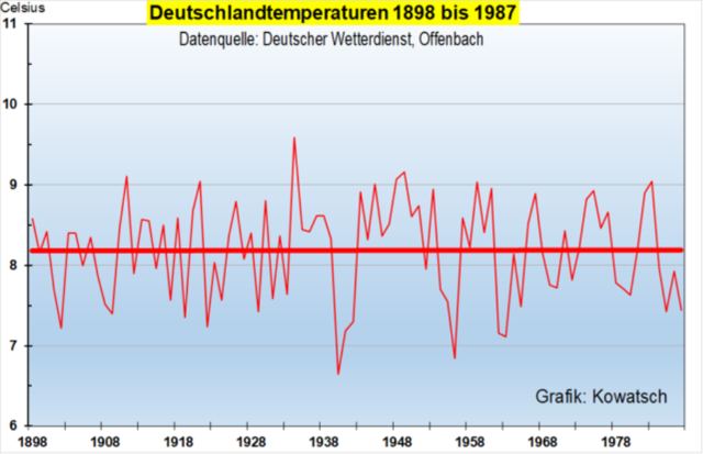 Abbildung 1 90 Jahre lang gab es laut DWD-Temperaturreihe keinerlei Erwärmung in Deutschland, trotz stark steigender CO2-Konzentrationen in der Atmosphäre. Hat die CO2-Erwärmungswirkung etwa 90 Jahre lang ausgesetzt?