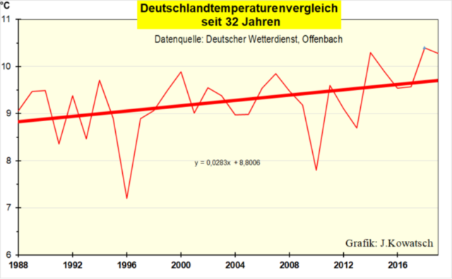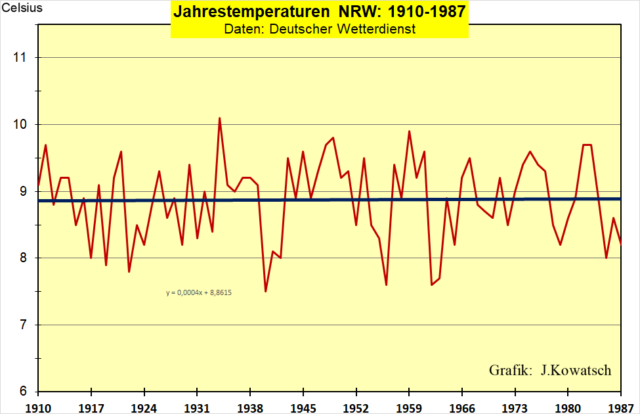 Anmerkung: Die folgenden Ausführungen und Graphen wurden dem Beitrag von J. Kowatsch „Wo ist die Erwärmungswirkung des CO2-Treibhauseffektes bei den Deutschlandtemperaturen?“ [2] entnommen, und soweit zitiert, in Parenthese gesetzt (Hervorhebungen vom Autor). Sie illustrieren perfekt die aktuelle Klimaentwicklung in Deutschland und damit auch in NRW.