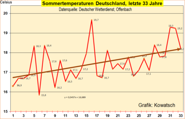Vor allem in Süddeutschland haben aufmerksame Naturbeobachter diesen Trend der Sommererwärmung längst festgestellt. Die Sommer sind mediterraner geworden, was die allermeisten Menschen sehr begrüßen. Über die Mittagszeit sind die Temperaturen in den Innenstädten sommers oftmals bis fast an 40°C herangekommen, die dunklen Asphaltstraßen der freien Landschaft werden 50°C heiß und speichern die Wärme in die Nachtstunden hinein. Der Gründe des Sommertemperatursprunges seit 1988 haben natürliche Ursachen. Die weiteren Gründe der starken Sommererwärmung dürften ausschließlich menschengemacht sein: Die ständige Trockenlegung der freien Landschaft, aber auch die sich täglich fortsetzende ausufernde Bebauung der Siedlungen, Gewerbe- und Industriegebiete in die einst freie kühlende Landschaft hinein. Wo eine neue Siedlung entsteht, fällt die endotherm ablaufende Fotosynthese, die ein Großteil der Sonnenwärme in Wachstum umsetzt, weg, aber auch die kühlende Verdunstung der grünen Flora entfällt.“ Zitatende.