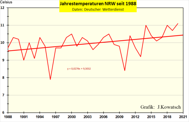 Nach den Daten des Deutschen Wetterdienstes (DWD) ist die Mitteltemperatur in NRW im linearen Trend bezogen seit 1910 um ca. 1,6 Kelvin gestiegen und liegt damit leicht über dem Anstieg in Deutschland. Insgesamt stieg dort die Mitteltemperatur seit Beginn der Aufzeichnung ab 1880 um ca. 1,45 Kelvin an. Der ist fast allein dem Anstieg von 1988 bis 2020 geschuldet (Siehe Abbildung 1 und Abbildung 2), der insgesamt ebenfalls bei 1,45 Kelvin liegt. Die Trendlinie der Jahrzehnte zuvor zeigt bis 1988 so gut wie keinen Anstieg.