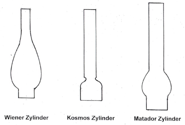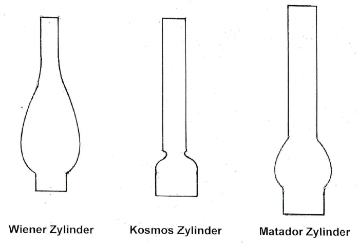 Zu jedem Brenner gehört der passende Zylinder, bei denen man Wiener Zylinder (für Flachbrenner), Kosmos Zylinder (für Runddochtbrenner) und Matador Zylinder (für Flammscheibenbrenner) unterscheidet. Die Wahl eines falschen Zylinders kann zur Zerstörung desselben führen.