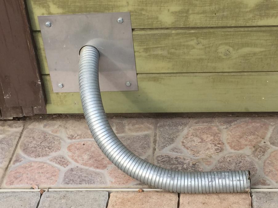 Bild 24: Durchleitung der Abgase eines Dieselaggregats durch eine Laubenwand mittels flexiblem Edelstahl-Abgasschlauch