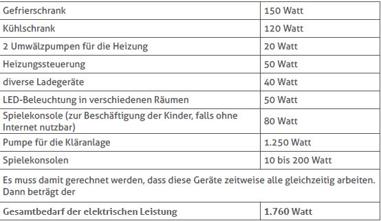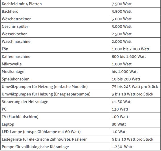 Zunächst sollte man sich eine Übersicht darüber verschaffen, welche elektrische Leistung die in der Wohnung / im Haus vorhandenen Geräte aufnehmen. Dazu gibt die folgende Tabelle eine Hilfestellung: