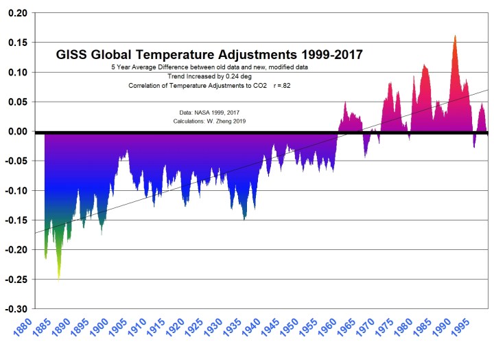Was Wei Zhang veranschaulicht hat, ist eine fast perfekte Korrelation zwischen den Adjustierungen der Temperaturdaten, die von NASA GISS (und Gavin Schmidt) vorgenommen wurden, und der CO2-Konzentration in der Atmosphäre. Sie haben die Vergangenheit vor 1960 (etwa zu der Zeit, als die CO2-Messungen auf dem Mauna Loa begannen) künstlich abgekühlt und von 1960 bis heute künstlich erwärmt.