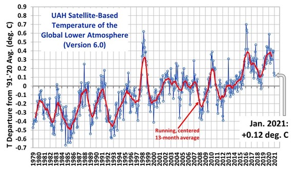 Gäbe es einen THE von 33°C, wie IPCC behauptet, dann müßte das absolute Temperaturniveau der UAH-Kurve ohne THE um 33°C tiefer liegen. Wenn man IPCC glaubt, trägt das anthropogene CO2 nahezu zu 100% zum THE bei. Offenbar vermutet diese Theorie, daß 3 Moleküle auf 10.000 (300 ppm) diese 33°C bewirken und das eine weitere auf 10.000 (400 ppm) das bewirkt, was die Satellitenkurve zeigt. Um das zu verstehen, ist „100%ig nachhaltige Koboldphysik“ notwendig …