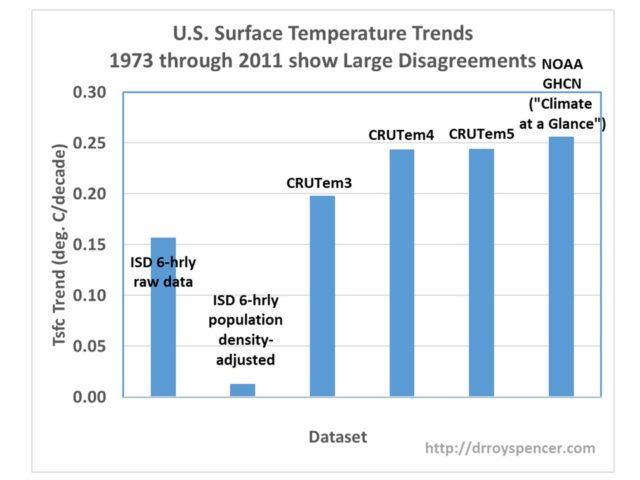 In seiner Analyse untersuchte Dr. Spencer einen anderen Datensatz, der von der National Oceanic and Atmospheric Administration (NOAA) verwaltet wird, und fand heraus, dass Wetterstationen, die zur Messung von Klimatrends verwendet werden, niedrigere langfristige Temperaturtrends melden, wenn sie um die Bevölkerungsdichte bereinigt werden: