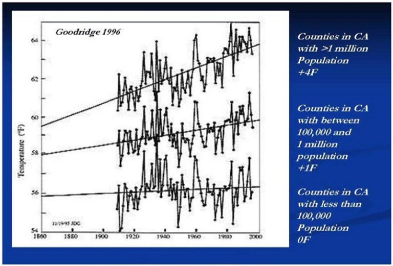 Diese Korrelation zwischen der Bevölkerungsdichte und dem Temperaturtrend wurde bereits 1996 von James Goodridge festgestellt, der genau den gleichen Effekt in Kalifornien fand, indem er die Bevölkerungszahl eines Bezirks im Vergleich zu den Temperaturtrends der Wetterstationen untersuchte. Goodridge veröffentlichte eine von Experten begutachtete Arbeit zu diesem Thema im Bulletin of the American Meteorological Society. Seine Grafik verdeutlicht den Punkt: