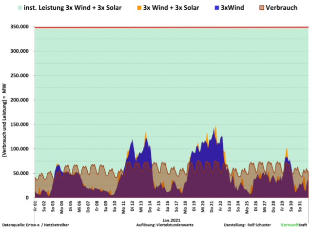 Simulierte Wind- und Solareinspeisung gegenüber Verbrauch und 3 fach installierter Leistung im Januar 2021. Installierte Leistung ca. 350 GW. Daten Entso-e; Grafik Ralf Schuster Vernunftkraft