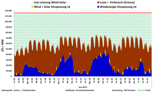 Wind- und Solareinspeisung gegenüber Verbrauch und installierter Leistung im Januar 2021. Installierte Leistung ca. 116 GW. Daten Entso-e; Grafik Ralf Schuster Vernunftkraft
