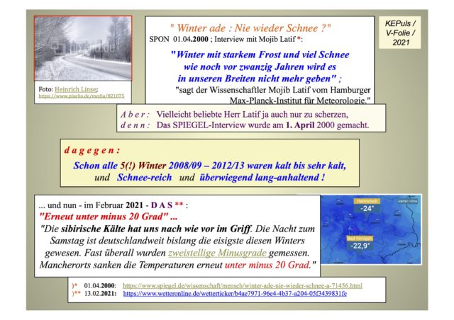 (2) Für die Klima-Propheten liegen die Dinge ein klein wenig anders: NICHT Kälte und Schnee sind die „Peinlichkeit“, – das hat es auch in historischen Warmphasen gegeben – sondern die groteske Aussage „es wird kälter, weil es wärmer wird“.