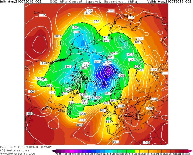 Abb.2 – Polarwirbel 21.10.2019: 500hPa(ca.5kmHöhe) + Bodendruck [6]