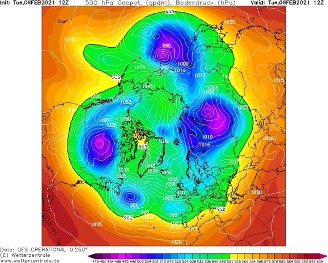 Abb.3 – Polarwirbel 09.02.2021: 500hPa(ca.5kmHöhe) + Bodendruck [6]