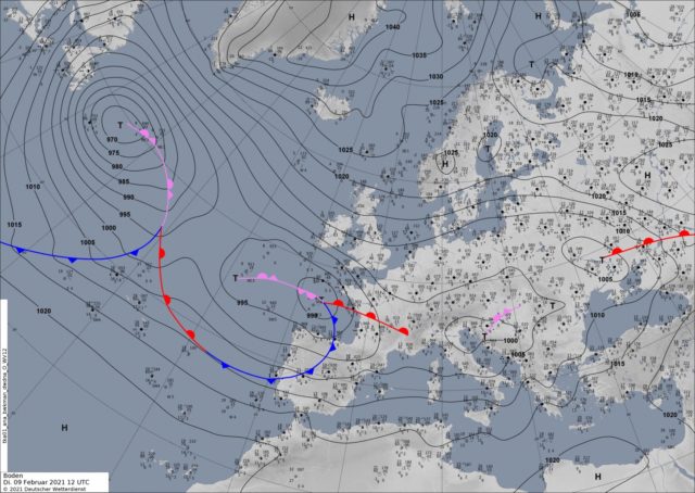 Abb.4 – Bodenwetter-Karte DWD v. 09.02.2021 (gleiches Datum wie Höhenkarte in Abb.3)