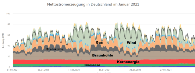 Abbildungen 1a bis c: Das hatte sich die Politik anders vorgestellt – Wind (hell blau-grau) und Sonne (kaum sichtbare, gelbliche Spitzen) sollten doch längst den meisten Strom erzeugen – aber das Wetter spielt nicht mit. Weder im Dezember 2020 (oben, 1a) noch im Januar 2021 (Mitte), noch im Februar 2021 (bis Monatsmitte vorliegend, unten) wehte über längere Zeiträume ausreichend Wind, der meist bloß kümmerliche 1 bis 15% des Stroms lieferte, selten mal deutlich über 20%. Da hätten auch doppelt so viele Windräder nicht geholfen – es fehlte an Wind, der sie antreiben könnte. Nur die verbliebenen Kohle- und Kernkraftwerke sowie neue Gaskraftwerke verhinderten massive Stromausfälle (Blackouts). Bildquellen energy-charts.info, ergänzt.