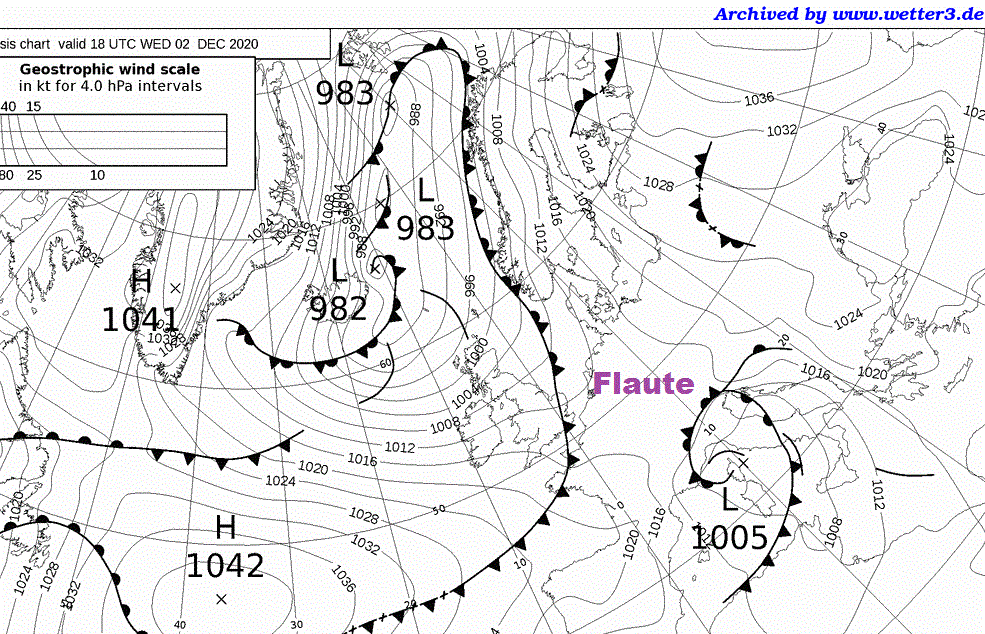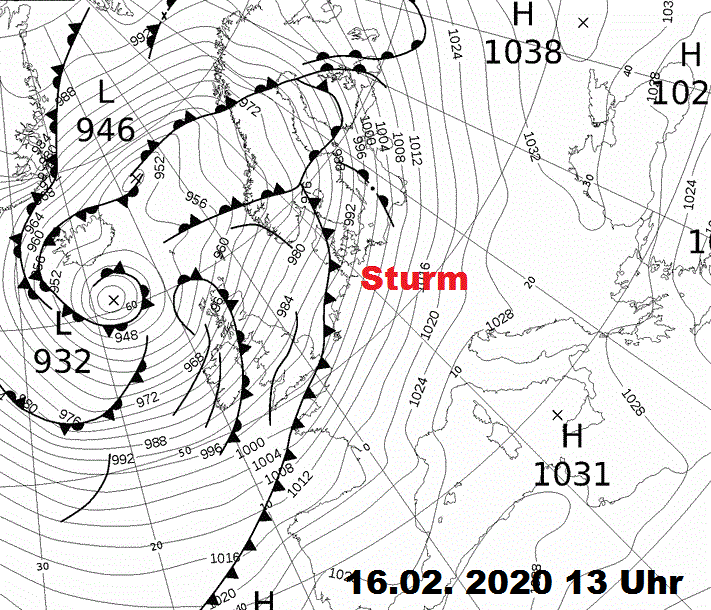 Abbildung 4: Südweststurm am 16. Februar 2020 (viele Isobaren über Deutschland). Bildquelle wetter3.de aus dem UKMO-Wetterkartenarchiv; ergänzt.