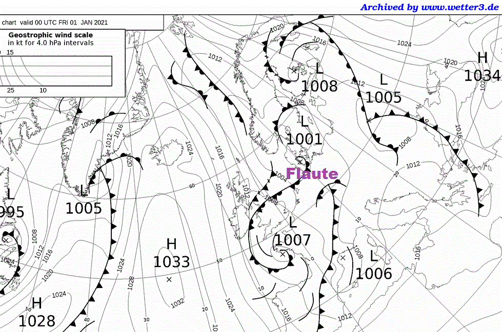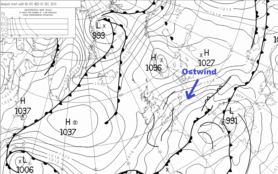 Eine längere, typische, windschwache Hochdruckwetterlage war nur während der Kältewelle um den 10. Februar zu beobachten (von Skandinavien nach Mitteleuropa ziehendes Hochdruckgebiet); auf diese soll hier nicht näher eingegangen werden. Aber warum verliefen auch Dezember und Januar, in welchen Kälte-Hochs fehlten, so windschwach? Die wesentliche Ursache findet sich in kleinen, mit Höhen-Kaltluft gefüllten Rand- und Teiltiefs, welche vom Atlantik und von Großbritannien immer wieder nach West- und Mitteleuropa zogen, sich hier abschwächten oder auflösten und dabei mehr oder weniger intensive Schnee- und Regenfälle auslösten, aber wegen ihrer geringen Stärke kaum noch Wind ermöglichten; zumal sich oft gleich mehrere dieser Tiefs in unserer Nähe befanden (zwischen zwei oder mehr Tiefs liegt ebenfalls eine nahezu windstille Zone). Schon Neujahr begann mit einer solchen Lage: