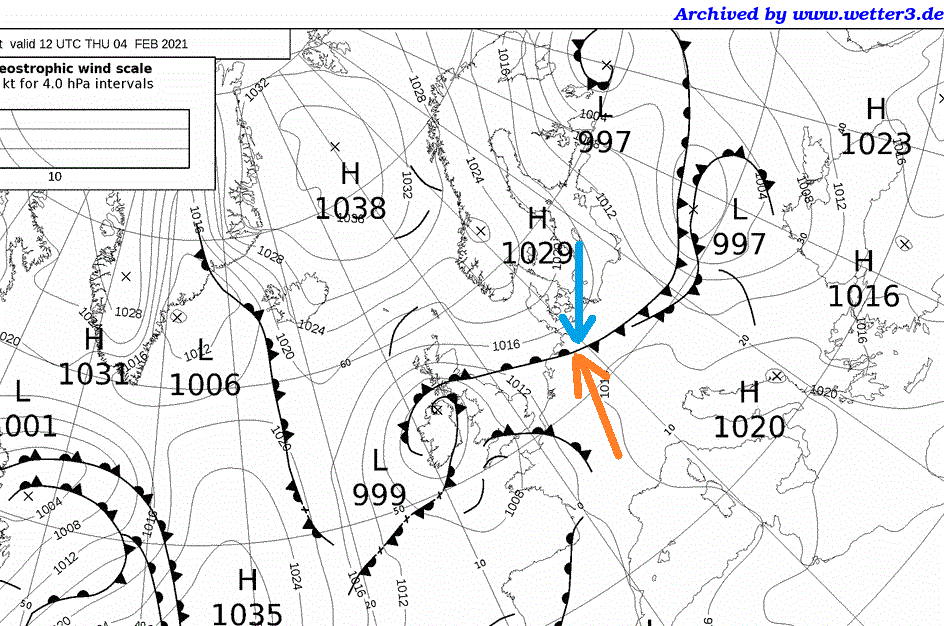 Abbildung 6: In einer schwachen Tiefdruckrinne treffen Warm- und Kaltluft aufeinander (Luftmassengrenze). Wenig Wind in weiten Teilen Deutschlands; Lage vom 4. Februar, Mittags. Bildquelle wetter3.de aus dem UKMO-Wetterkartenarchiv; ergänzt