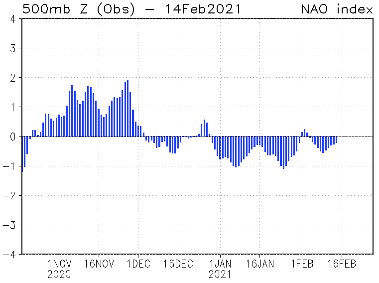 Abbildung 8: Tageswerte der NAO seit Mitte Oktober 2020 bis zum 14. Februar 2021. Aufrecht stehende Balken bedeuten positive, nach unten zeigende negative NAO-Indexwerte. Nach deutlich positiven NAO-Werten im Spätherbst überwogen im Winter ganz eindeutig negative Werte, allerdings nur in moderaten Ausmaßen. Bildquelle: NOAA