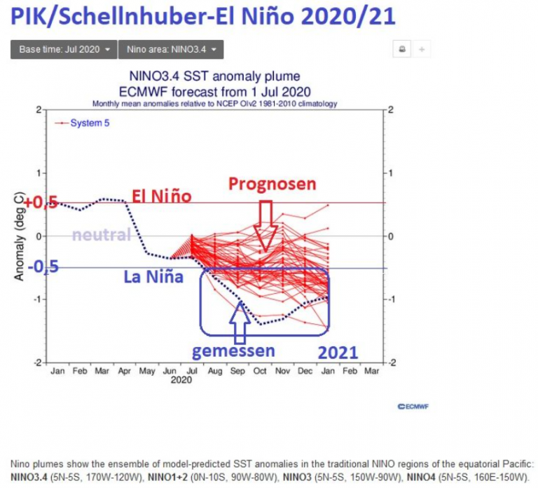Die ECMWF-Prognosen waren im Durchschnitt etwa ein Grad Celsius zu warm. Seit August 2020 gibt es La-Niña-Bedingungen mit Messwerten von -0,5°C Abweichung und kälter.