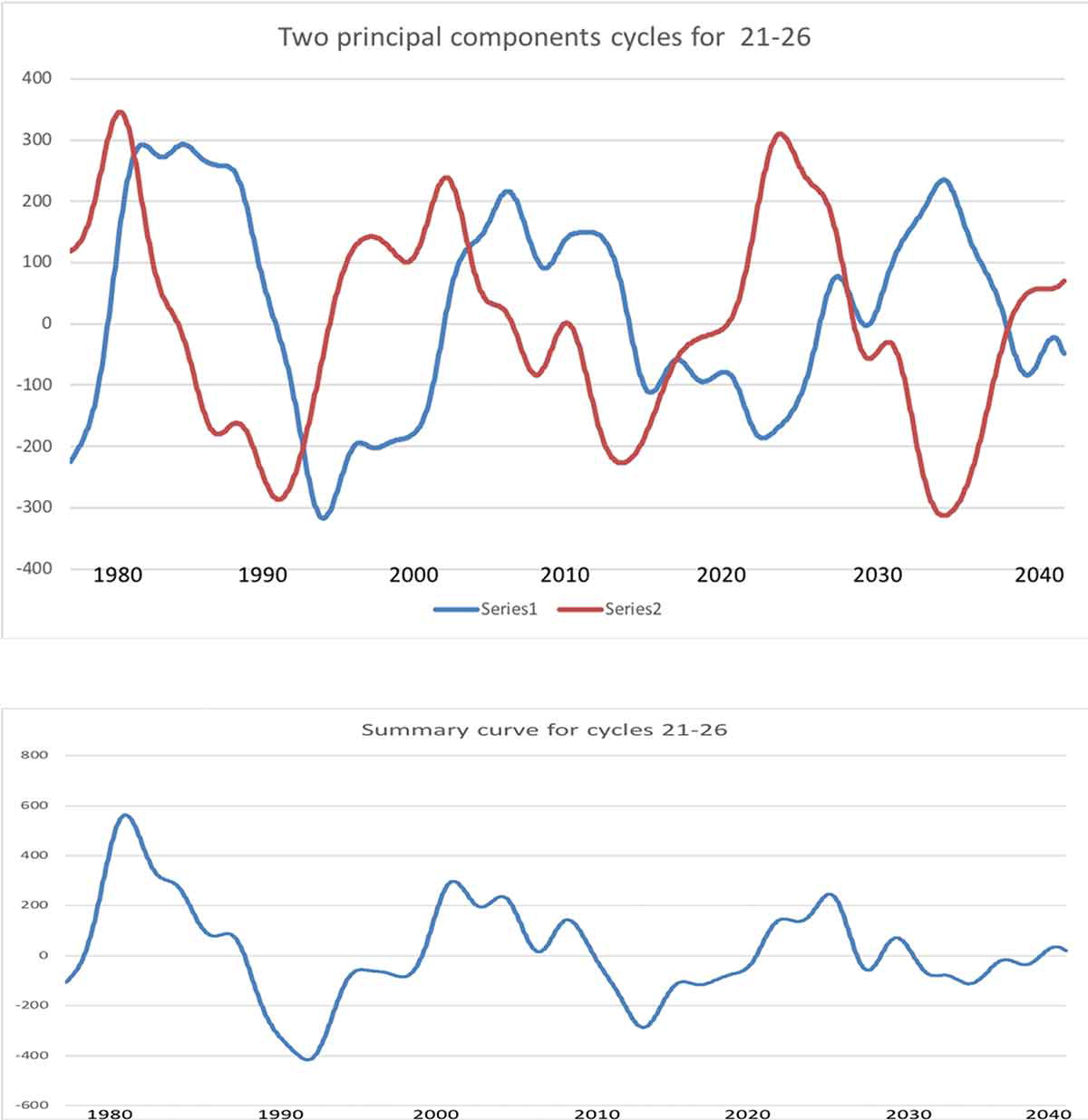 Abbildung 1. Oberer Plot: zwei Hauptkomponenten (PC) des solaren Hintergrundmagnetfeldes (blaue und grüne Kurven, willkürliche Zahlen), ermittelt für die Zyklen 21-23 (historische Daten) und vorhergesagt für die Zyklen 24-26 unter Verwendung der mathematischen Formeln, abgeleitet aus den historischen Daten (aus den Daten von Zharkova et al. [1]). Der untere Plot: Die Summenkurve, abgeleitet aus den beiden obigen PCs für die „historischen“ Daten (Zyklen 21-23) und vorhergesagt für den Sonnenzyklus 24 (2008-2019), Zyklus 25 (2020-2031), Zyklus 26 (2031-2042) (aus den Daten von Zharkova et al. [1]).